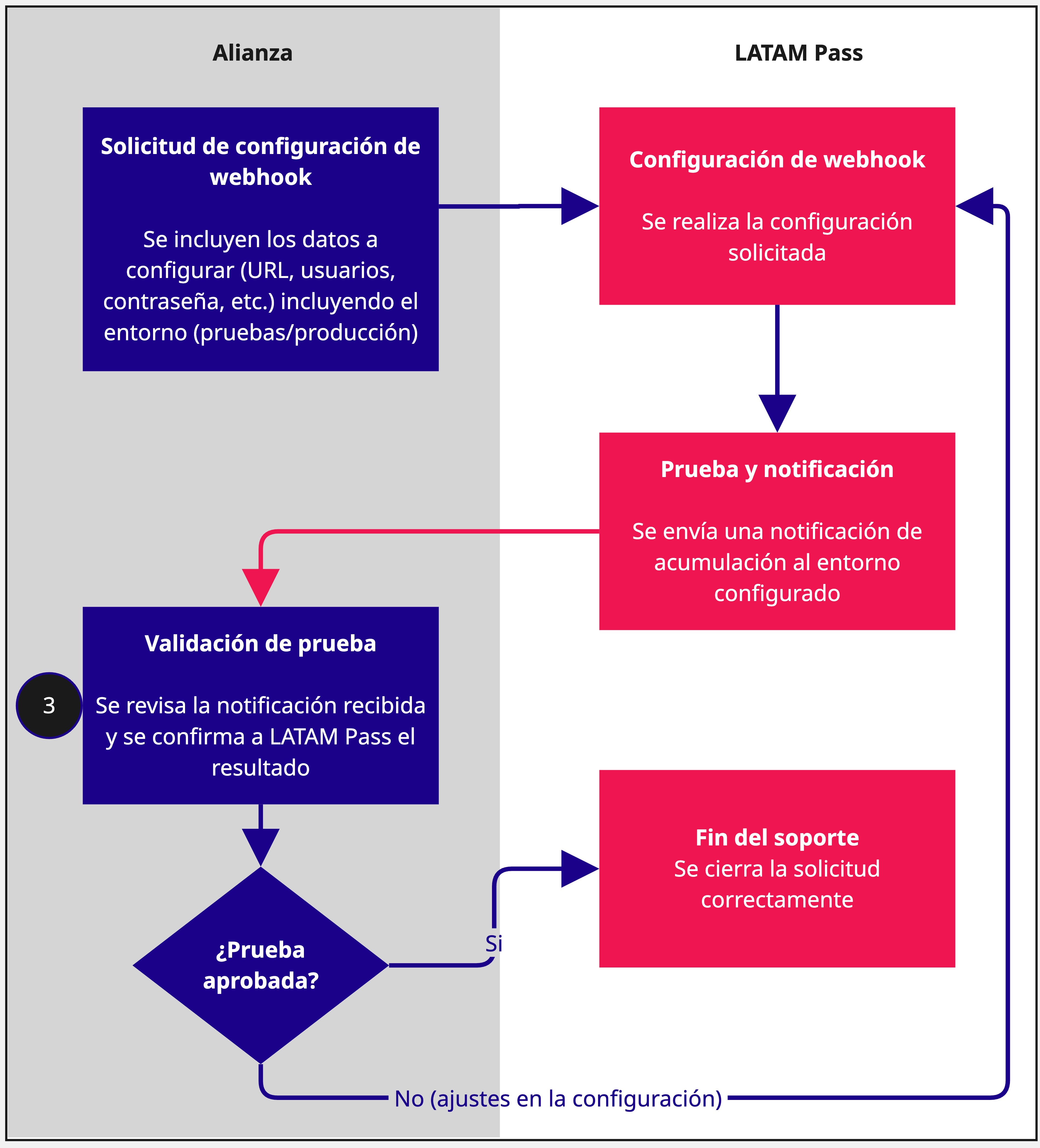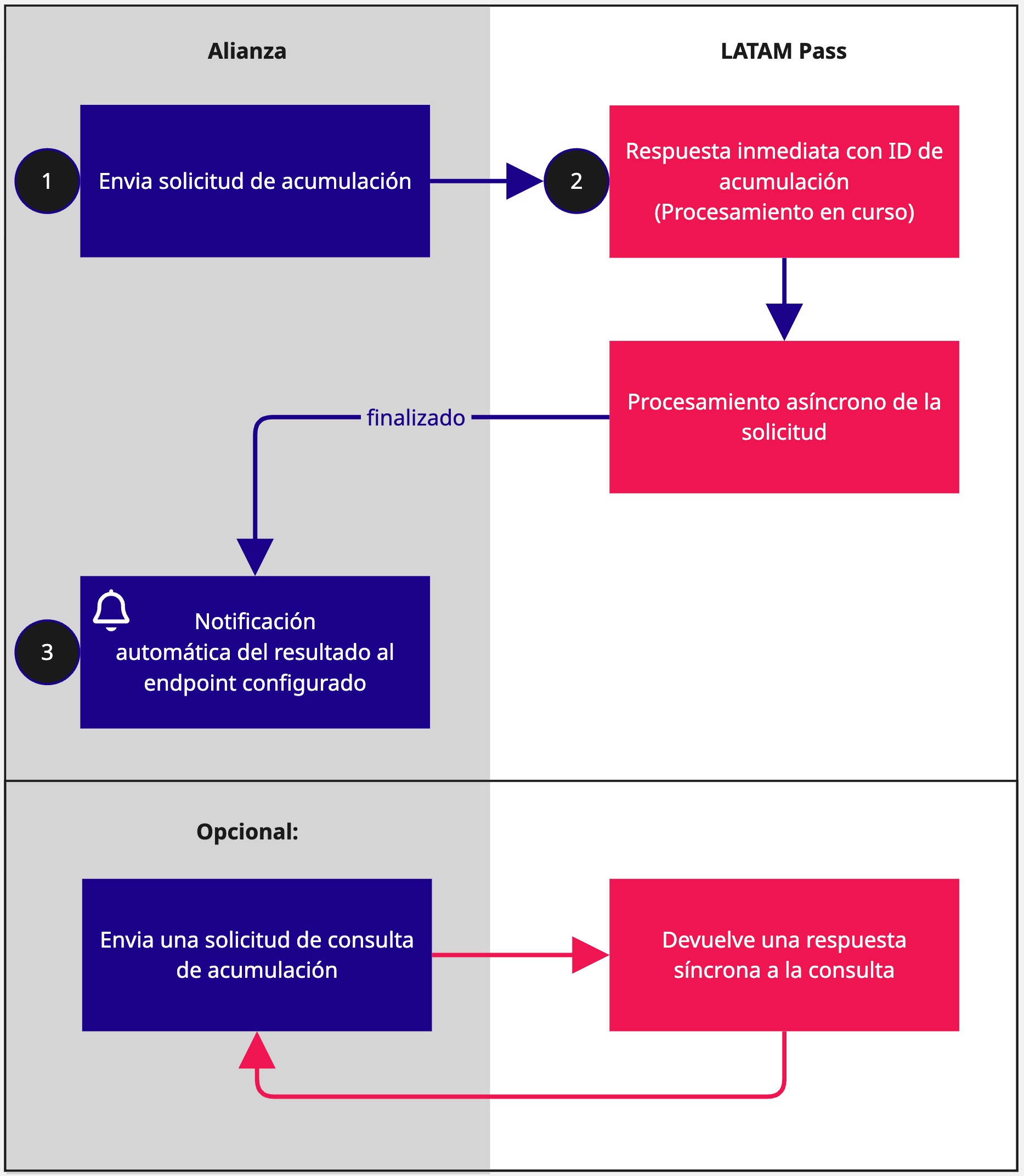 - URL del servidor de la alianza: endpoint donde LATAM Pass enviará los resultados de la acumulación mediante webhook. Ejemplo: https://api.mi-alianza.com/accrual-webhook