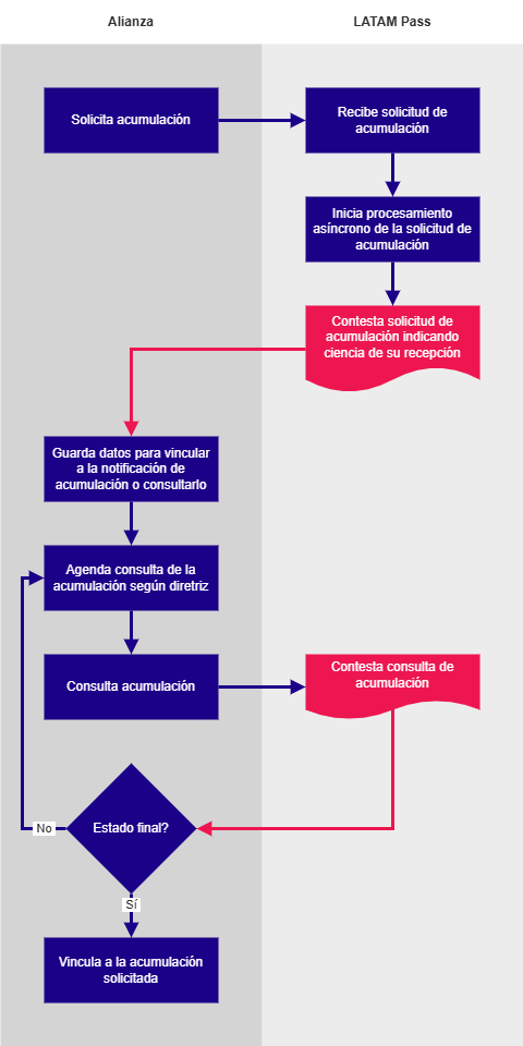 Después de Solicitar acumulación, las alianzas realizan la consulta de acumulación para obtener el estado de su procesamiento, ya que es asíncrono.